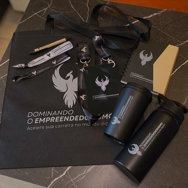 Cada item é planejado para transmitir a identidade da marca, reforçar valores e criar experiências memoráveis para os participantes.